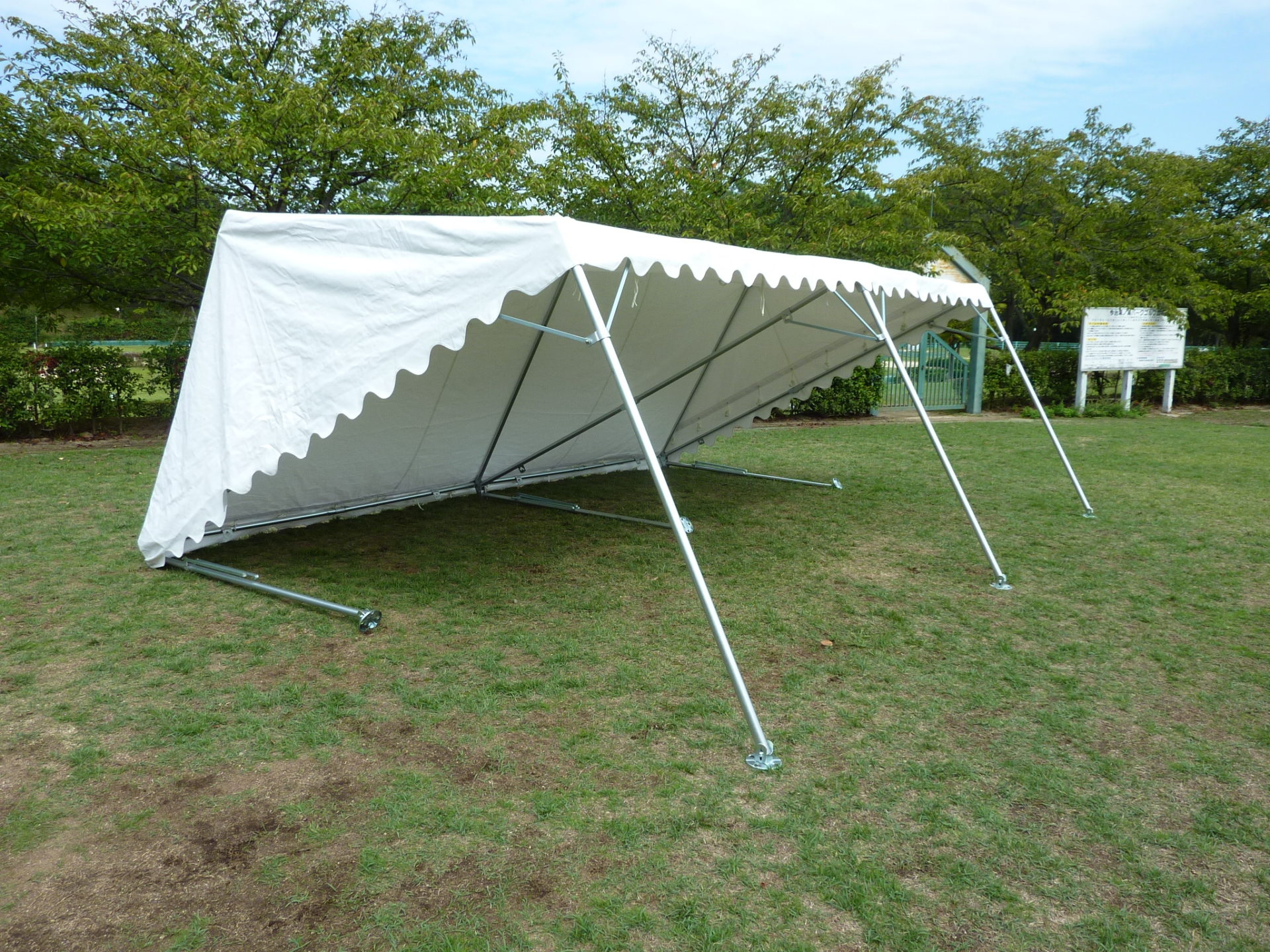 3分割(2間×3間)で構成されるワンタッチ式の便利さはそのままに、支柱を38.1φ(通常31.8φ)に仕上げました。まさしくイベント等に最適です。