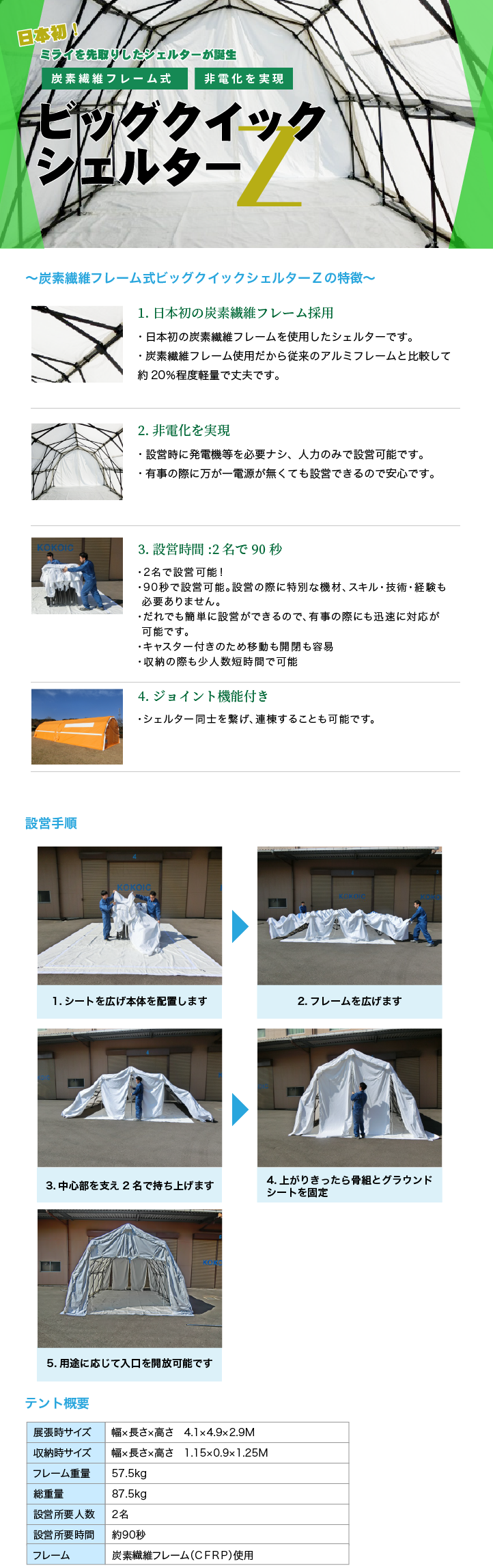 1.日本初の炭素繊維フレーム採用日本初の炭素繊維フレームを使用したシェルターです。
