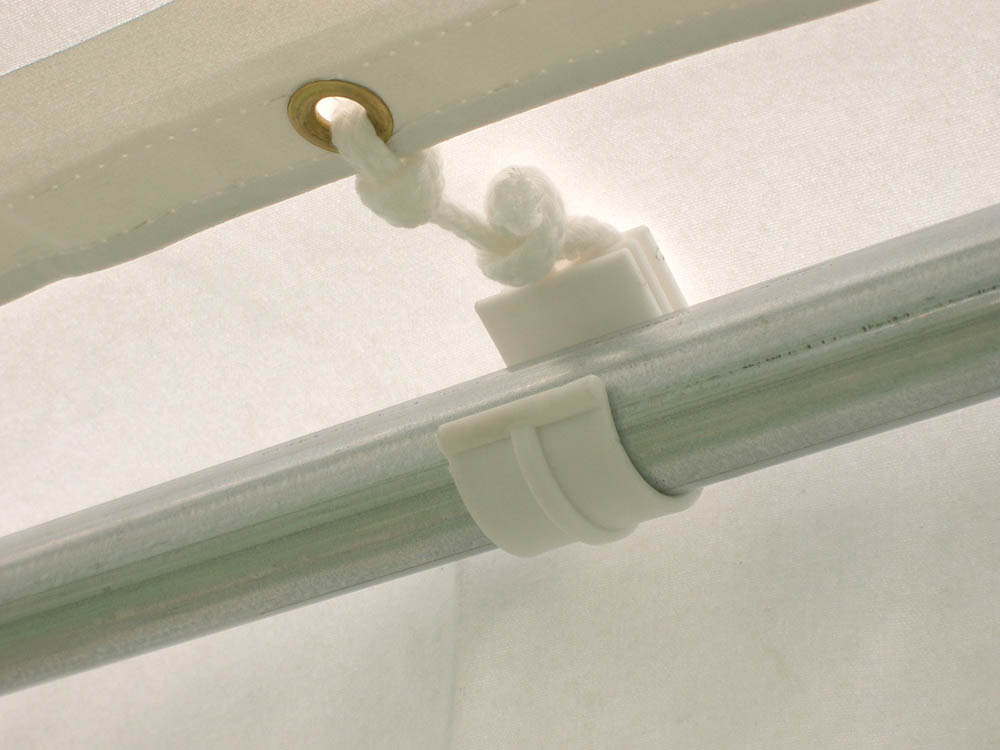天幕を骨体に固定する時は2mの高さのパイプに紐で固定するので、きちんと固定できないことが多かったのですがTSクリップ(R)(特許申請中)でクリップするだけなので誰にでも簡単にキチンと固定できるようになりました。