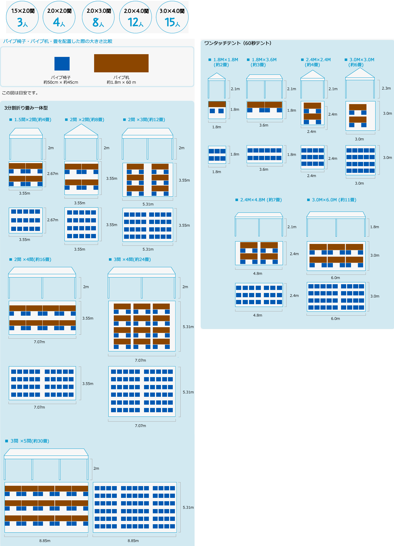 日本人の成人男性の平均身長及び体重(身長約170cm、体重約65kg、肩幅55cm)をモデルに横になった際隣人との距離にある程度ゆとりを持たせたものになります。下記表内の収容人数はあくまで目安です。