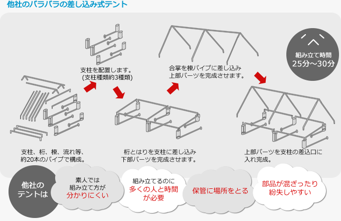 他社HPで設営方法の説明がなく、安価なものは、ほとんどのものが部材がバラバラの差し込み式です。